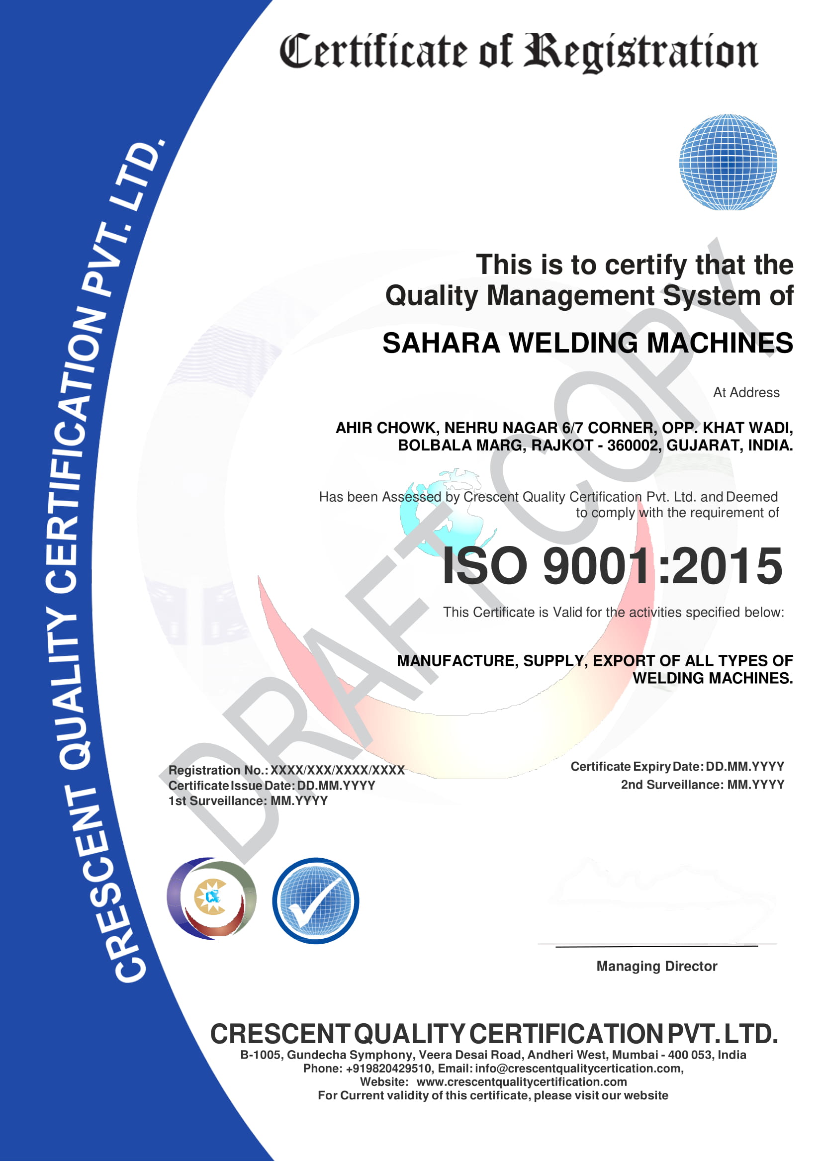 We pay atmost attention to the quality as this is the main factor on which our company is based. We are supported by a spacious infrastructure facility. We have installed highly advanced tools and machinery in our manufacturing unit. Also, we are divided into different teams that take care of all the processes of designing, manufacture, quality check, and control. In addition to this, our made of exporting licence. Also, we offer our products under the SAHARA WELDING MACHINES Brand name in the market.